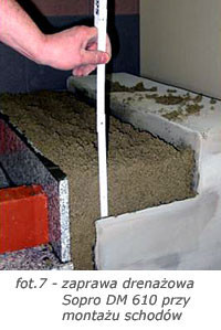 Firma Sopro jest jedynym producentem wyrobu o powyższych właściwościach. Nowym produktem znajdującym coraz więcej zwolenników w niektórych obszarach zastosowań (schody, tarasy, parkingi) jest zaprawa drenażowa Sopro DM 610 o szczególnych właściwościach antykapilarnych. Dzięki wodoprzepuszczalności i zawartości trasu zapobiega wykwitom i uszkodzeniom związanym z ujemnymi temperaturami (fot. 7).