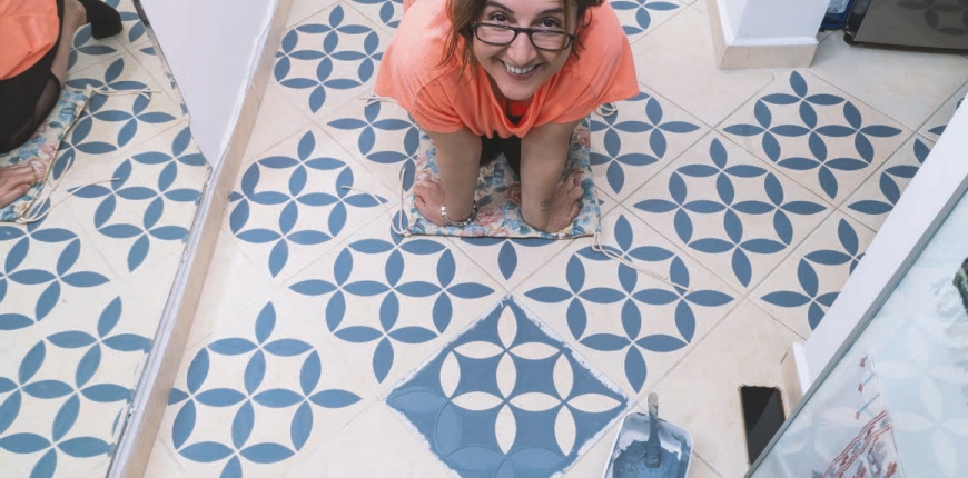 Arabeski i ornamenty to wzory zarówno jednoelementowe, jak i bardzo skomplikowane. W przypadku niewielkich pomieszczeń warto wybrać prosty wzór graficzny. Należy do nich prezentowany w aranżacji motyw łezki układający się w regularnie powtarzające się kwiaty, który możemy wykonać za pomocą gotowych szablonów malarskich. Styl marokański to też kolor – farby w odcieniach szarości i błękitów są jak najbardziej odpowiednie. Zanim przystąpimy do malowania, przygotujmy podłoże. Posadzka musi być równa, czysta i odtłuszczona – trzeba wyszorować płytki i fugi. Błyszczące płytki trzeba będzie zmatowić przy pomocy papieru ściernego. Zagruntowanie podłogi przed malowaniem poprawi przyczepność podłoża i podniesie trwałość okładziny