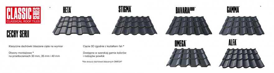 Serię CLASSIC reprezentują blaszane pokrycia dachowe idealnie dopasowane do projektu dachu ALFA®, OMEGA® i GAMMA®, w 2020 roku dołączyły do nich premierowe profile HETA®, BAVARIA®Roof i STIGMA. Profile dachówek klasycznych są produkowane w formie arkuszy blachy ciętej na konkretny, zamówiony wymiar.