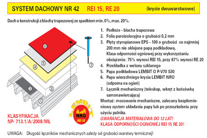 Dla przekrycia: dach z blachy trapezowej profilowanej, folia paroizolacyjna o grubości 0,2 mm, termoizolacja płyty styropianowe EPS 100-038, pokrycie z papy asfaltowej podkładowej LEMBIT OP-V70 S30 i papy wierzchniego krycia LEMBIT NRO; system przeszedł badania i posiada raport odporności ogniowej warstwowego przekrycia dachu: KLASYFIKACJA NP-713.1/A/2008/.
