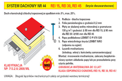 2.Prace montażowe z papą LEMBIT NRO w zakresie klasyfikacji odporności ogniowej REI15 , RE20, REI30, REI45 w systemach dachowych lembit mogą odbywać się po uprzednim skontaktowaniu z działem doradztwa technicznego firmy LEMAR lub regionalnym kierownikiem sprzedaży w celu otrzymania pełnej informacji w zakresie zastosowania określonej papy. Prace te powinny być nadzorowane przez inspektora nadzoru budowlanego w zakresie montażu i inspektora ochrony przeciwpożarowej w zakresie spełnienia klasyfikacji odporności ogniowej warstwowych przekryć dachowych z izolacją cieplną z płyt styropianowych lub z wełny mineralnej.
