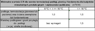 Zgodnie z wymaganiami prawnymi zawartymi w Warunkach Technicznych grubość termoizolacji URSA XPS podłogi, ściany zewnętrznej lub fundamentów dla budynków mieszkalnych (przy ogrzewanej piwnicy) nie powinna być mniejsza niż 5 -6 cm. Pozostałe wymagania podano w tabeli.