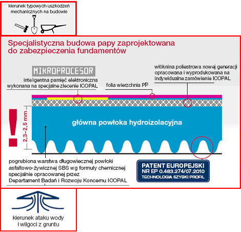 Fundament Szybki Profil SBS - specjalistyczna papa do hydroizolacji części podziemnych obiektów budowlanych produkowana w oparciu o PN-EN 13969:2006. Swoją unikalność zawdzięcza specjalnej budowie - wielokrotnie kalandrowana i hartowana włóknina poliestrowa nowej generacji jest przesunięta w kierunku wierzchniej powierzchni papy, dzięki temu gruba warstwa asfaltu modyfikowanego od spodu perfekcyjnie zabezpiecza elementy podziemne budynku. Wierzch papy pokryty jest folią polipropylenową odporną na wpływ promieni UV przez okres 6 miesięcy. Spód papy wykonany jest w technologii Szybki Profil co umożliwia szybką aplikacje i całkowicie szczelne przytwierdzenie jej do podłoża przy zużyciu niewielkiej ilości gazu. Papa ta dzięki swojej specyficznej budowie jest odporna w znacznym stopniu na przebicia i uszkodzenia mechaniczne w czasie budowy - bez obawy o uszkodzenie warstwy hydroizolacyjnej można po niej chodzić , magazynować materiały budowlane, jeździć taczkami itp.