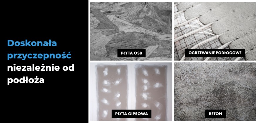 • doskonały rozpływ, szczególnie istotny na podłogi, tarasy, balkony, ogrzewanie podłogowe