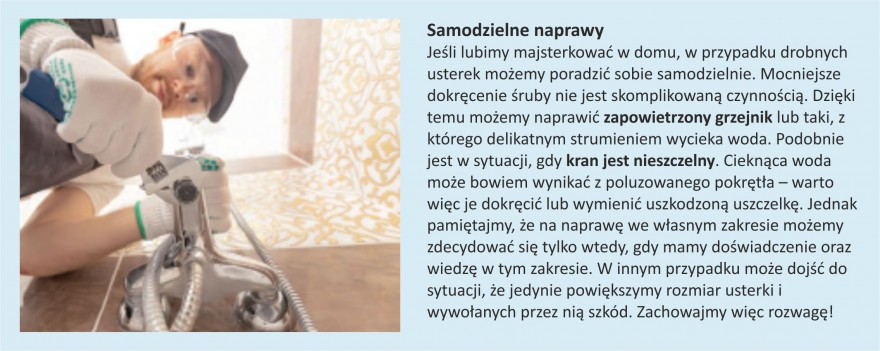 Niewielkie usterki urządzeń sanitarnych, instalacji wodociągowej czy kanalizacyjnej zdarzają się w każdym domu – przecież eksploatujemy wszystkie sprzęty w nim zamontowane. Nie ma się co zatem dziwić, że na co dzień używana kuchnia czy łazienka będzie raz na jakiś czas wymagać kilku napraw. W wielu przypadkach poradzimy sobie sami bez pomocy fachowca. Wystarczy trochę czasu oraz odpowiednie narzędzia.