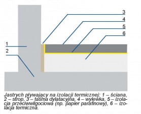 Jastrych pływający - czyli oddzielony od elementów konstrukcji budynku. Wykonuje się go na warstwie izolacji termicznej lub przeciwdźwiękowej. Materiałem izolacyjnym zazwyczaj są płyty styropianowe lub z wełny mineralnej. Należy zwrócić uwagę, by taśmy dylatacyjne oraz papier parafinowy, które oddzielają wylewkę od konstrukcji budynku, tworzyły szczelną wannę. Chodzi o to, aby płynny jastrych nie przedostał sie pod styropian i nie wypchnął go do góry.