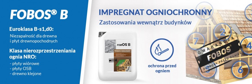 Najlepszym wyborem jest tutaj impregnat FOBOS® M-4, który nie tyko pozwala skutecznie zabezpieczyć drewno przed ogniem, lecz również chroni przed rozwojem grzybów domowych, pleśniowych i owadów. Ten środek od lat znajduje zastosowanie przy impregnacji tarcicy przeznaczonej na więźbę dachową, czy przy zabezpieczaniu prefabrykowanych wiązarów. Środek ten nie powinien być stosowany w warunkach zewnętrznych, przy narażeniu na kontakt z opadami atmosferycznymi. Dopuszcza się jedynie tymczasowe zawilgocenie zaimpregnowanych elementów, przy zapewnieniu odpowiedniej wentylacji konstrukcji. Dokładne wentylowanie zaimpregnowanych konstrukcji jest dodatkowo bardzo istotne, ponieważ solne środki po zastosowaniu mogą przyczyniać się do okresowego wilgotnienia powierzchni, które w niekorzystnych warunkach mogłyby stworzyć warunki do rozwoju grzybów. Środek pozwala na zabezpieczenie drewna konstrukcyjnego do klasy „niezapalności” i „nierozprzestrzeniania ognia NRO” (zgodnie z PN-EN 13501-1+A1:2010).